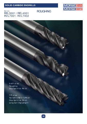 SOLID CARBIDE ENDMILLS EVH EGE Series ROUGHING REL3001 / REL4001 RVL7001 - RVL7402 3-4 Flutes Roughing Chip Splitter Pitch 7 Flutes Variable Helix & Pitch Chip-Splitter Pitch Long Cutting Length 20