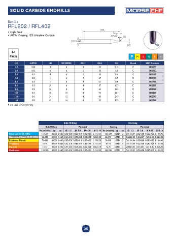 Vc (m/min) ap ae Ø 1-3 Ø 3-6 Ø 6-10 Ø12-16 Vc (m/min) ap ae Ø 1-3 Ø 3-6 Ø 6-10 Ø12-16
