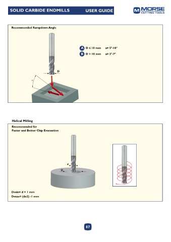 SOLID CARBIDE ENDMILLS USER GUIDE Recommended Rampdown Angle A D ≤ 10 mm a= 5°-10° ≤ B D > 10 mm a= 3°-7° D α Helical Milling Recommended for Faster and Better Chip Evacuation d D Dmin= d + 1 mm Dmax= (dx2) -1 mm 87